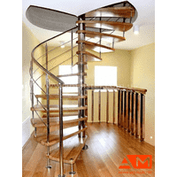 Чудовий зразок гвинтових сходів для дому та, навіть, квартири, декоровані дерев’яними сходинками. Перила та опора виконані із нержавіючої сталі.